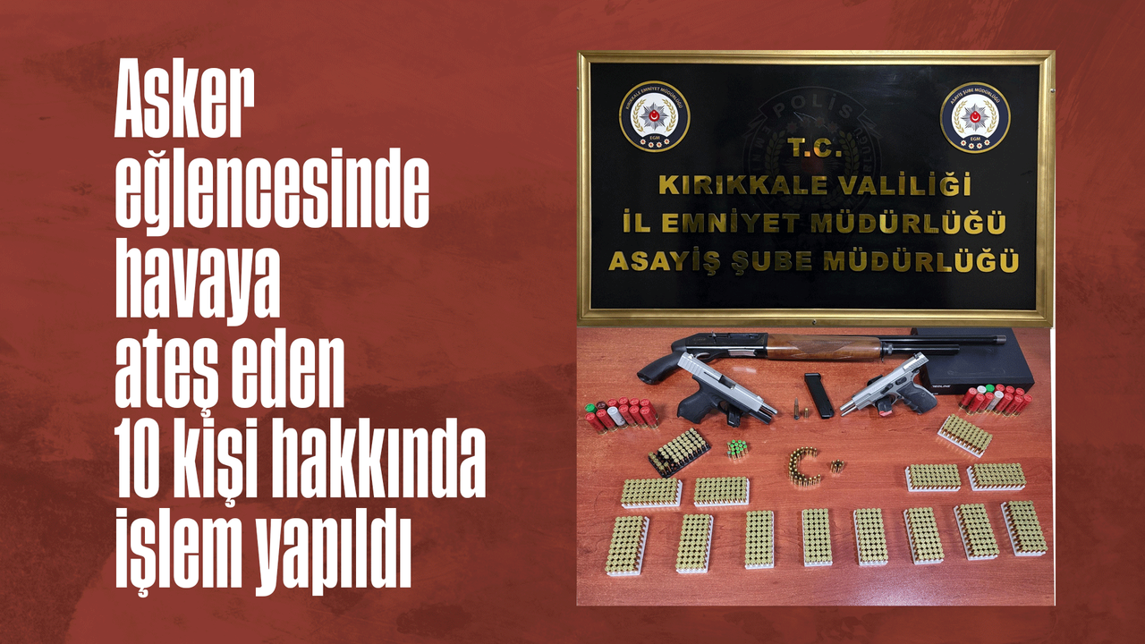 Olay, dün akşam saatlerinde Karşıyaka Mahallesi Pınar Caddesinde meydana geldi. Kalabalık bir grubun havaya ateş ettiği yönündeki ihbarlar üzerine bölgeye polis ekipleri sevk edildi. Asker eğlencesi yapıldığı belirlenen adreste yerde 190 boş kovan olduğu tespit etti. Bunun üzerine nöbetçi cumhuriyet savcısından alınan arama kararı kapsamında, 3 ikamet ve 8 araçta yapılan aramalarda 1 ruhsatsız tabanca, 1 av tüfeği, 1 kurusıkı tabanca ve 763 fişek ele geçirildi. Eğlencede bulunan 1’i kadın 10 kişi hakkında "genel güvenliği kasten tehlikeye sokmak" suçundan adli ve idari işlem yapıldı.