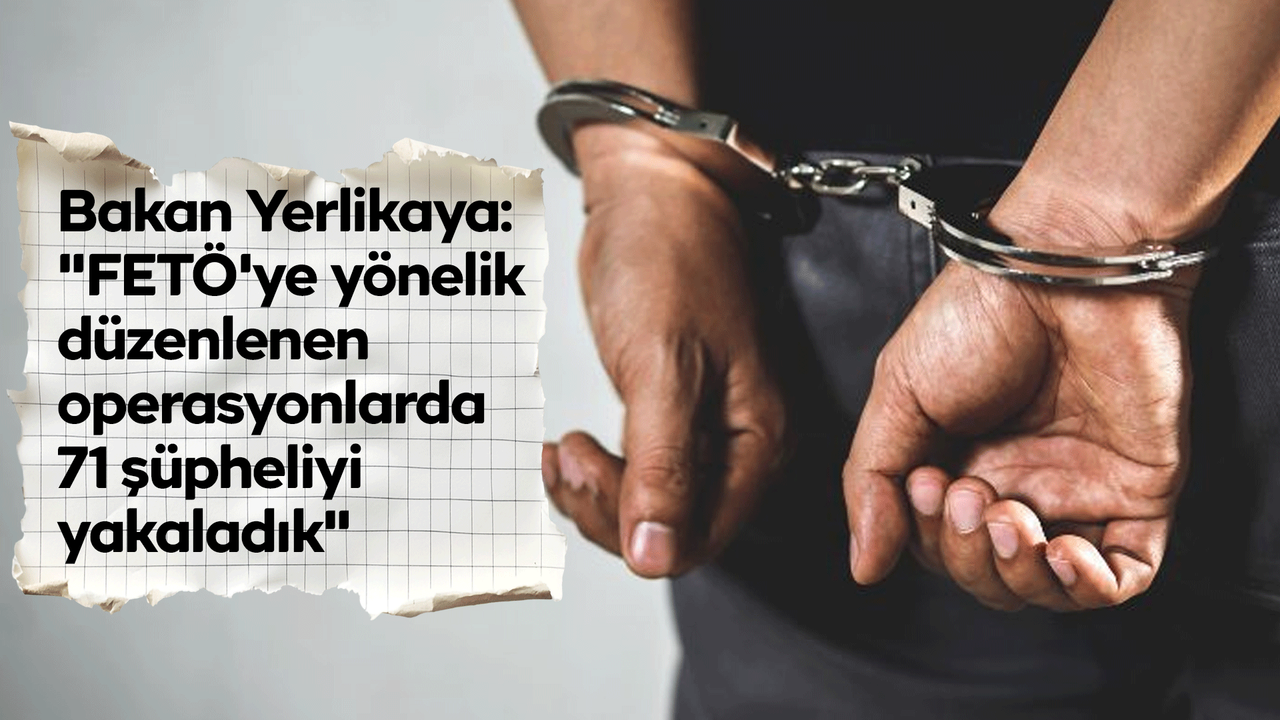 İçişleri Bakanı Yerlikaya, sosyal medya hesabından yaptığı paylaşımda İstanbul merkezli olmak üzere Adana, Aksaray, Ankara, Antalya, Balıkesir, Batman, Bolu, Çanakkale, Gaziantep, İzmir, Kayseri, Kocaeli, Konya, Kırıkkale, Kırşehir, Manisa, Malatya, Muş, Sakarya, Sivas, Tekirdağ, Amasya, Aydın Bursa, Mersin ve Zonguldak'ta FETÖ'ye yönelik düzenlenen operasyonlarda kamu görevlisi ve özel sektör çalışanı 71 şüpheliyi yakaladıklarını belirtti.