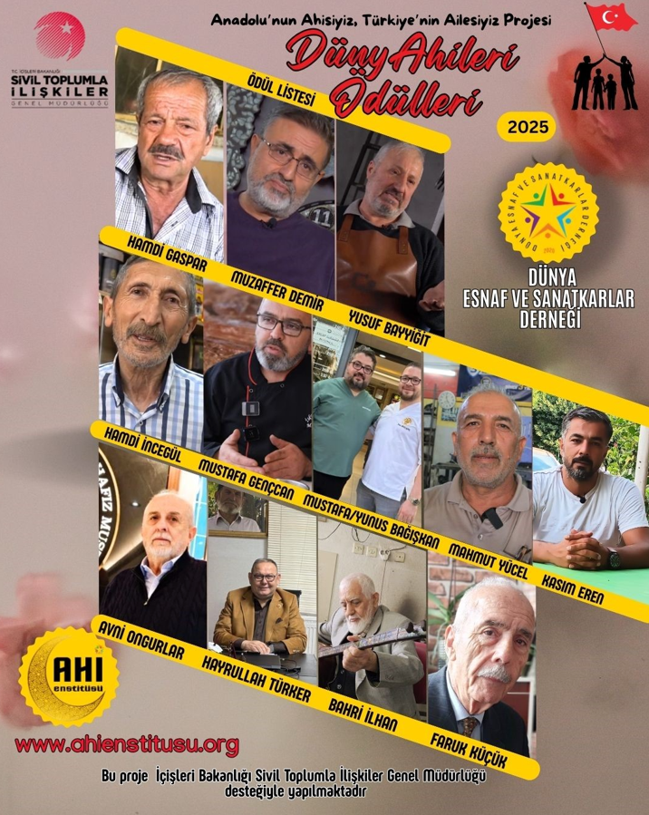 Dünya Esnaf ve Sanatkarlar Derneği -Ahi Enstitüsü tarafından yürütülen ve İçişleri Bakanlığı Sivil Toplumla İlişkiler Genel Müdürlüğü tarafından desteklenen ‘Anadolu’nun Ahisiyiz, Türkiye’nin Ailesiyiz’ projesi kapsamında verilen ödüller, esnaf ve sanatkarlar için önemli bir yere sahip oldu. Ödüller, Unutulmaya Yüz Tutmuş 3 Nesil Mesleğini Yaşatanlar, Mesleğini Sanatla Buluşturanlar, Başarı Öyküleri, Afet’in Esnafları, Medya Tanıtım ve Aktivite Alanları olarak 6 ana kategoride dağıtıldı.