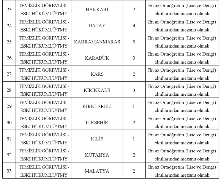Adaylara ayrıca yazılı tebligat yapılmayacak olup, tüm duyurular Bakanlığın resmi internet sitesi üzerinden ilan edilecek. Başvuru ve yerleştirme sürecinde gerçeğe aykırı beyanda bulunan adayların işlemleri ise iptal edilecek. Kırıkkale’de ise 3 temizlik personeli alınacak.