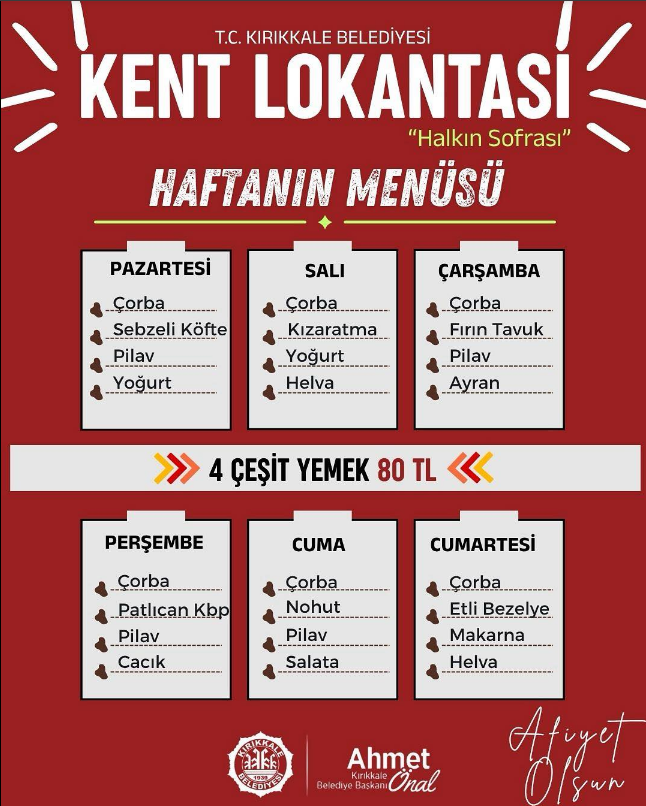 Belediyeden yapılan açıklamaya göre haftalık menü şu şekilde olacak: