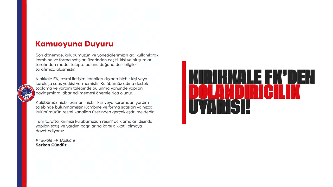 Kulüp Başkanı Serkan Gündüz imzasıyla yapılan açıklamada, bazı kişi ve oluşumların kombine ve forma satışı bahanesiyle vatandaşlardan maddi talepte bulunduğuna dair bilgilere ulaşıldığı belirtildi. Gündüz, “Kırıkkale FK, resmî iletişim kanalları dışında hiçbir kişi veya kuruluşa satış yetkisi vermemiştir. Kulübümüz adına destek toplama veya yardım talebinde bulunulduğu yönündeki paylaşımlara itibar edilmemesi önemle rica olunur,” ifadelerini kullandı.