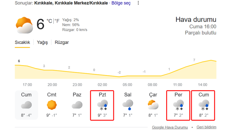Pazartesi günü hava sıcaklığının en yüksek 9, en düşük 3 derece olacağı, yağışın kar şeklinde görüleceği tahmin ediliyor. Perşembe günü de benzer şekilde kar yağışının etkili olması beklenirken, sıcaklıkların 7 ila 2 derece arasında seyredeceği öngörülüyor. Cuma günü ise kar yağışının devam edeceği, hava sıcaklığının en yüksek 8, en düşük 2 derece olacağı bildiriliyor. Yetkililer, özellikle sabah ve gece saatlerinde buzlanma riskine karşı sürücülerin dikkatli olmasını önerirken, vatandaşların hava koşullarına karşı tedbirli olması istendi.