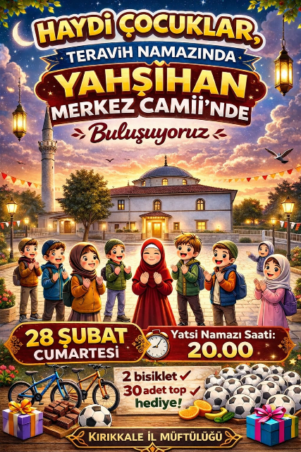 Etkinlik, 28 Şubat Cumartesi günü saat 20.00’de Yahşihan Merkez Camii’nde gerçekleştirilecek. Teravih namazında buluşma konseptiyle planlanan programda çocuklar için çeşitli sürprizler hazırlandı. Program kapsamında yapılacak çekilişle 2 bisiklet ve 30 adet top hediye edileceği bildirildi. İl Müftülüğü yetkilileri, çocukların cami ortamıyla daha fazla kaynaşmasını sağlamak ve manevi atmosferi birlikte yaşamak amacıyla tüm aileleri programa davet etti.