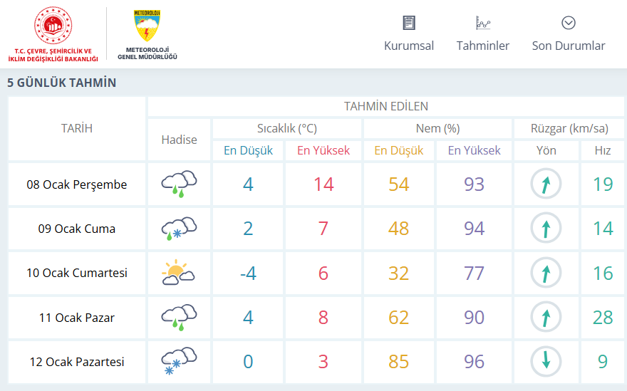 12 Ocak Pazartesi günü ise kar yağışı bekleniyor. Pazartesi günü hava sıcaklığının en düşük 0 derece, en yüksek 3 derece olması bekleniyor.