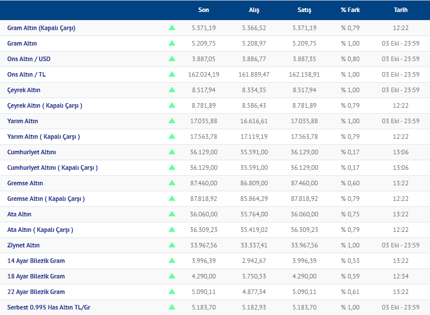 Gram altın yeni güne yükselişle başladı. Güne yükselişle başlayan gram altının bugünkü (03.10.2025) fiyatı, Kırıkkale Kuyumcular Derneğinin verilerine göre, gram altın 5371 liradan işlem görüyor.