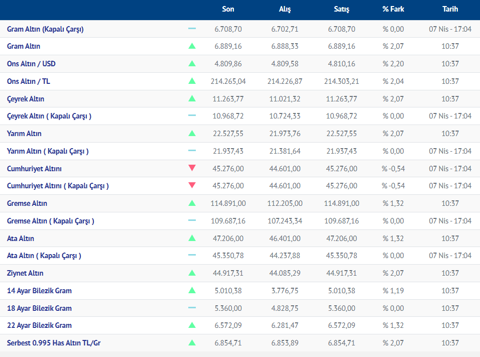 Gram altın yeni güne yükselişle başladı. Güne yükselişle başlayan gram altının bugünkü (08.04.2026) fiyatı, Kırıkkale Kuyumcular Derneğinin verilerine göre, gram altın 6889 liradan işlem görüyor.