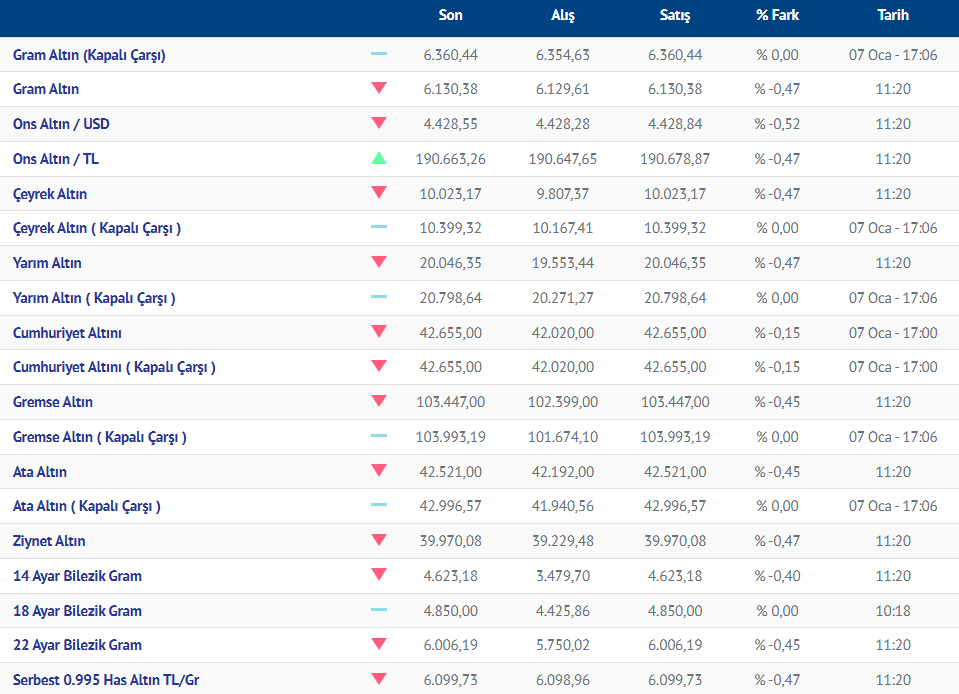 Gram altın yeni güne düşüşle başladı. Güne düşüşle başlayan gram altının bugünkü (08.01.2026) fiyatı, Kırıkkale Kuyumcular Derneğinin verilerine göre, gram altın 6130 liradan işlem görüyor.
