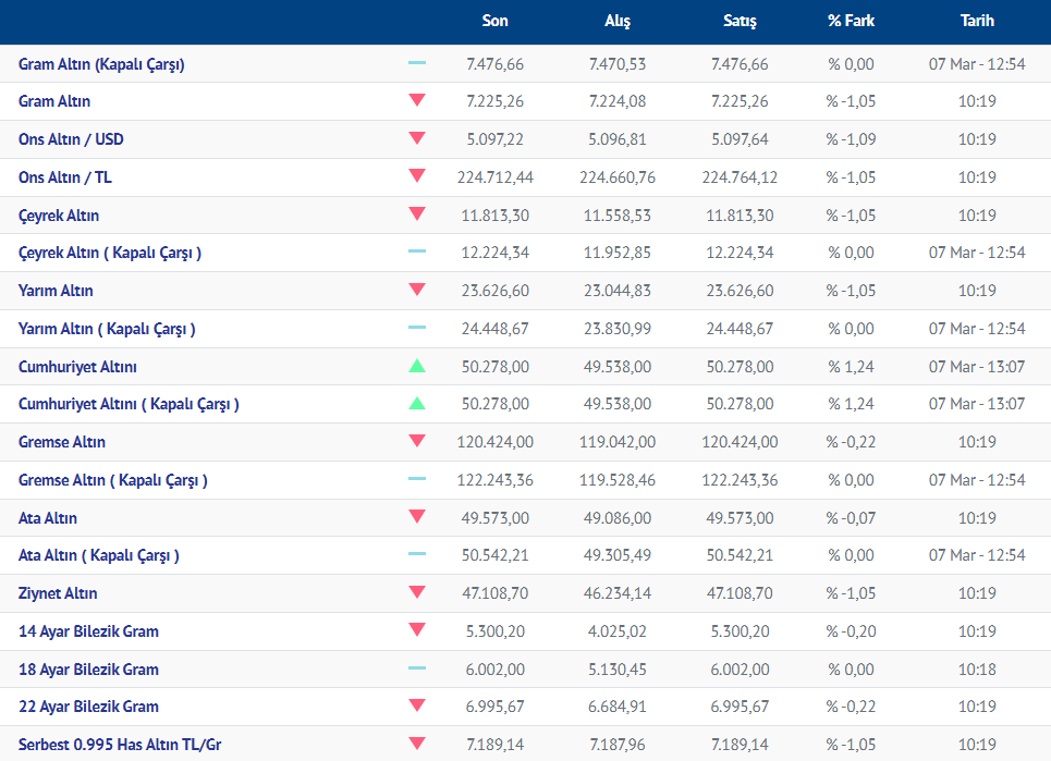 Gram altın yeni güne düşüşle başladı. Güne düşüşle başlayan gram altının bugünkü (09.03.2026) fiyatı, Kırıkkale Kuyumcular Derneğinin verilerine göre, gram altın 7225 liradan işlem görüyor.