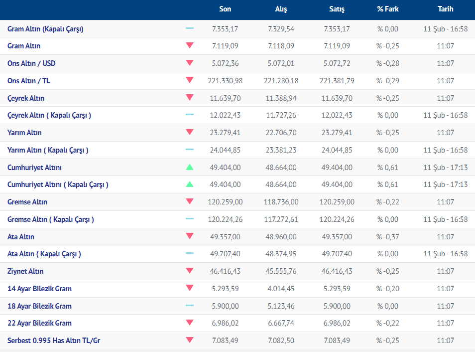 Gram altın yeni güne düşüşle başladı. Güne düşüşle başlayan gram altının bugünkü (12.02.2026) fiyatı, Kırıkkale Kuyumcular Derneğinin verilerine göre, gram altın 7119 liradan işlem görüyor.
