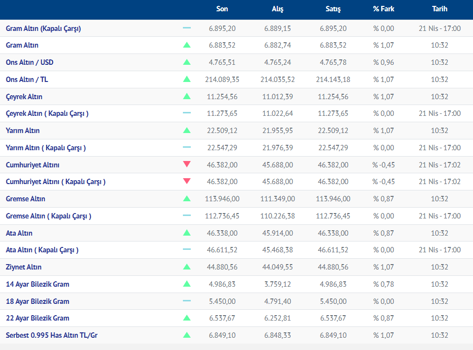 Gram altın yeni güne düşüşle başladı. Güne düşüşle başlayan gram altının bugünkü (22.04.2026) fiyatı, Kırıkkale Kuyumcular Derneğinin verilerine göre, gram altın 6883 liradan işlem görüyor.