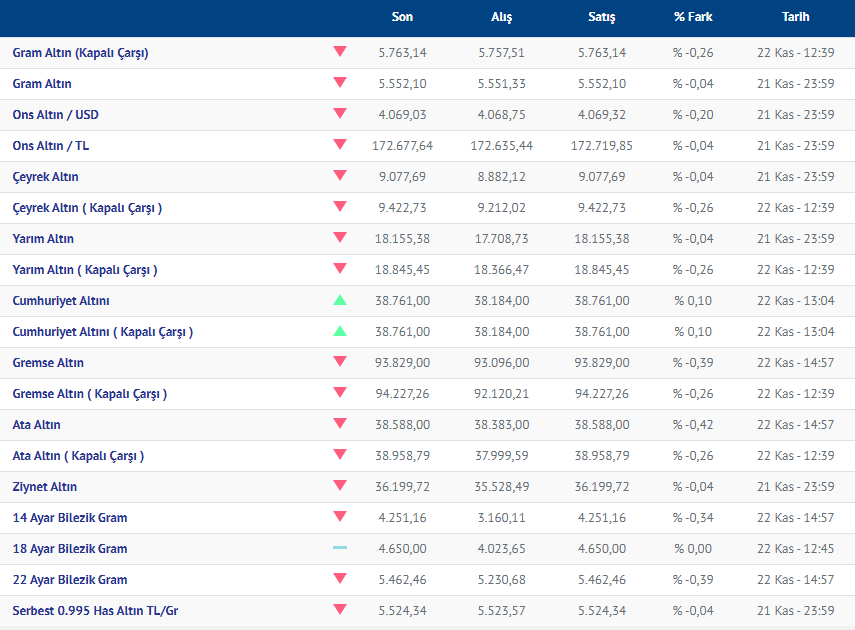 Gram altın dün günü düşüşle tamamlamıştı. Haftanın son iş gününe yükselişle başlayan altın, haftayı düşüşle tamamladı. Haftayı düşüşle tamamlayan Altının (23.11.2025) fiyatı, Kırıkkale Kuyumcular Derneğinin verilerine göre, gram altın 5,552 liradan işlem gördü. Hafta sonu piyasalarda hareketlilik yaşanmazken, altının yeni haftaya da düşüşle başlaması bekleniyor.