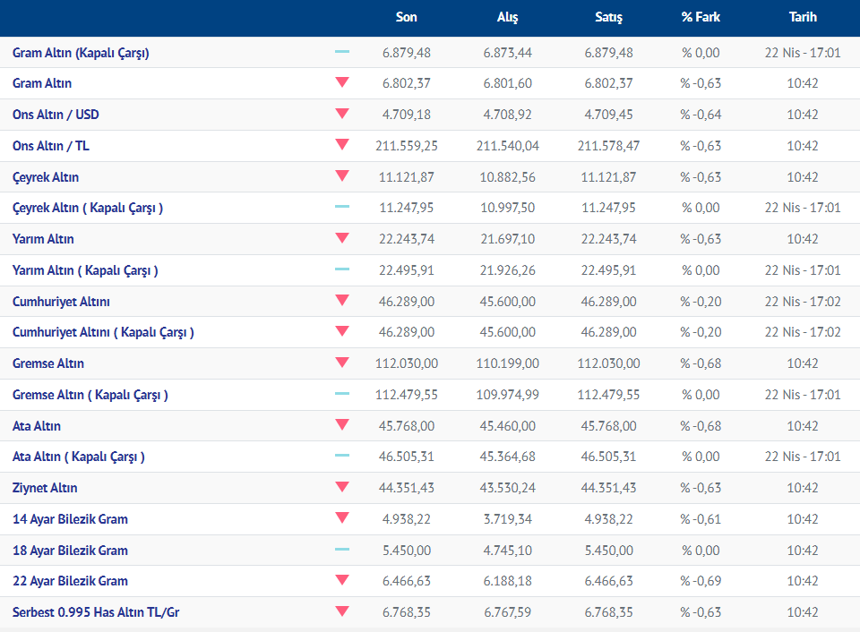 Gram altın yeni güne düşüşle başladı. Güne düşüşle başlayan gram altının bugünkü (23.04.2026) fiyatı, Kırıkkale Kuyumcular Derneğinin verilerine göre, gram altın 6802 liradan işlem görüyor.