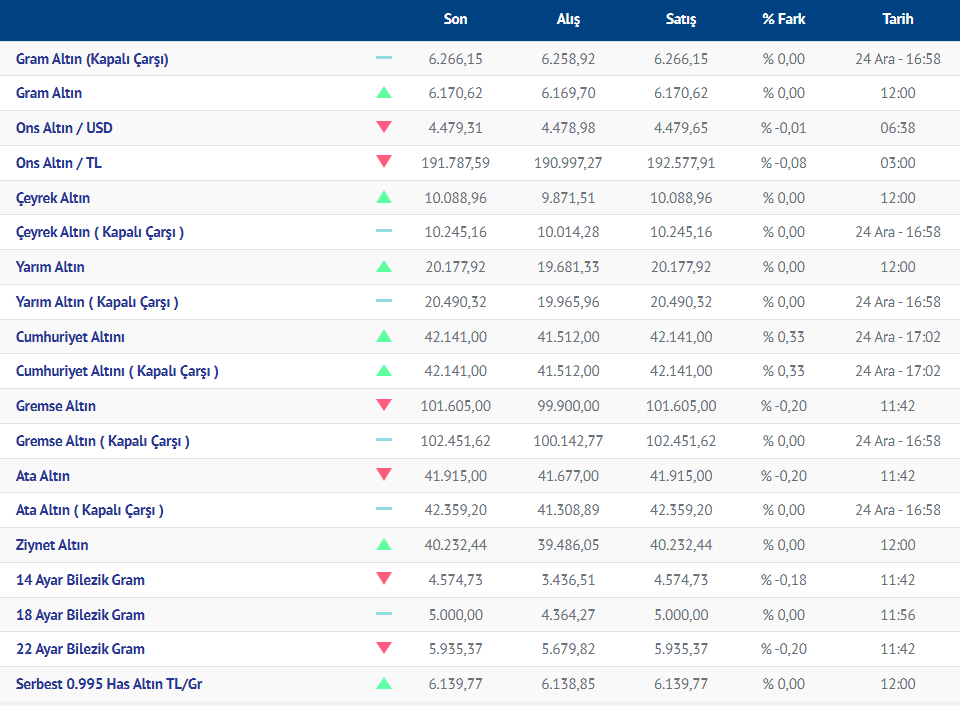 Gram altın yeni güne yükselişle başladı. Güne yükselişle başlayan gram altının bugünkü (25.12.2025) fiyatı, Kırıkkale Kuyumcular Derneğinin verilerine göre, gram altın 6170 liradan işlem görüyor.