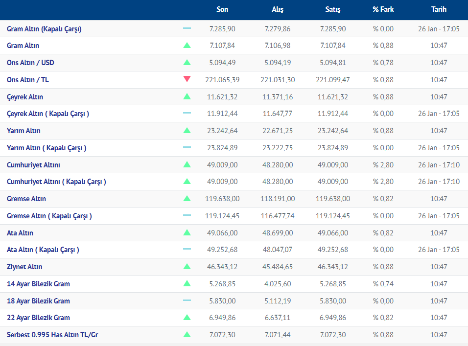 Gram altın yeni güne yükselişle başladı. Güne yükselişle başlayan gram altının bugünkü (27.01.2026) fiyatı, Kırıkkale Kuyumcular Derneğinin verilerine göre, gram altın 7107 liradan işlem görüyor.