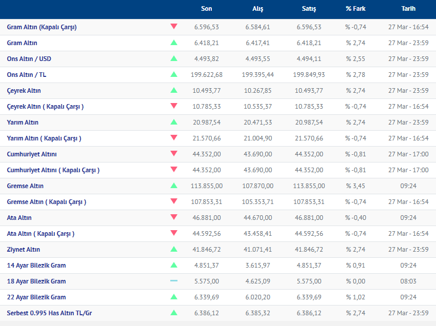 Gram altın dün günü yükselişle tamamlamıştı. Haftanın son iş gününe yükselişle başlayan altın, bugün de yükselişle devam etti. Güne yükselişle devam eden Altının (28.03.2026) fiyatı, Kırıkkale Kuyumcular Derneğinin verilerine göre, gram altın 6.418 liradan işlem görüyor.