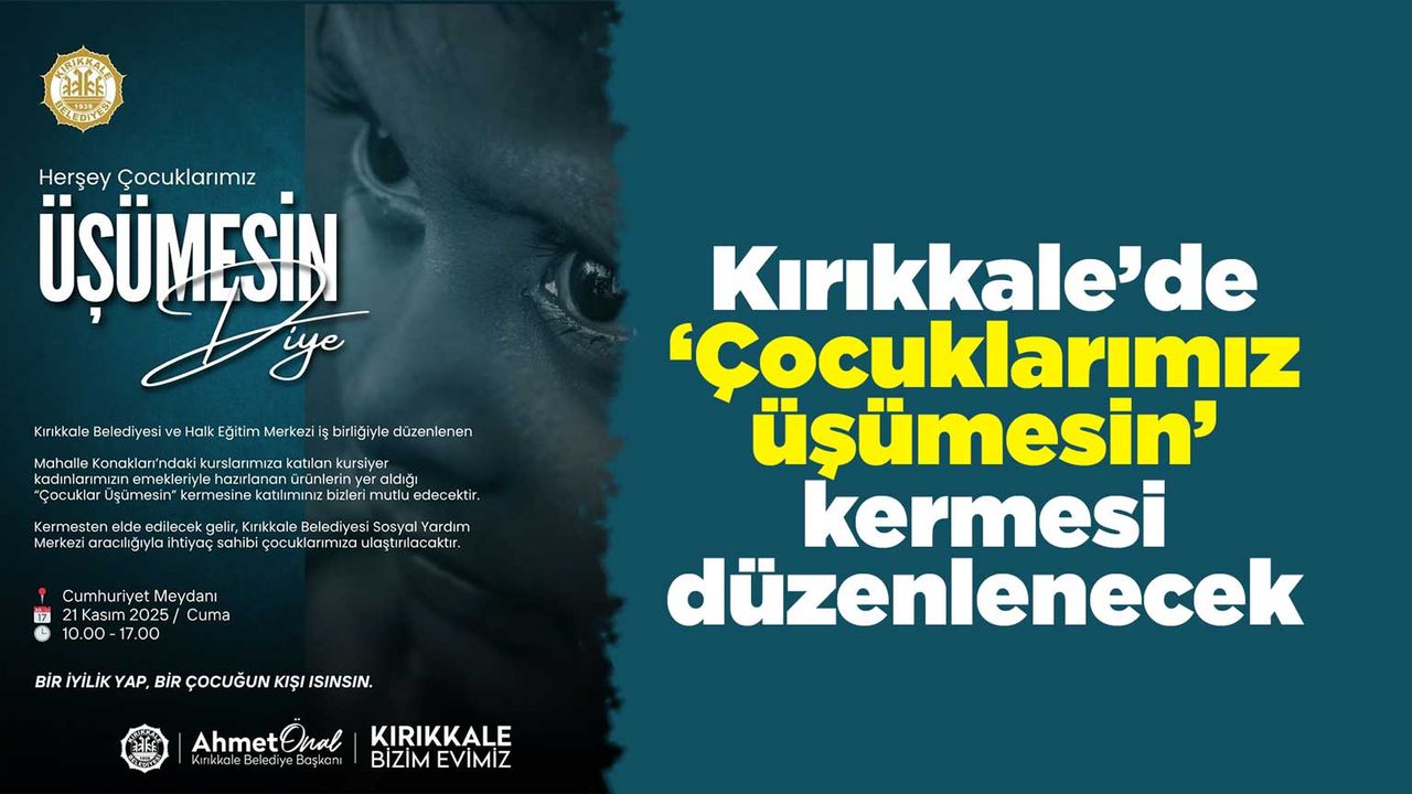 Kırıkkale Belediyesi ile Halk Eğitim Merkezi iş birliğiyle, Mahalle Konakları’nda eğitim alan kursiyer kadınların el emeği ürünlerinin yer alacağı “Çocuklarımız Üşümesin” kermesi 21 Kasım 2025’te gerçekleştirilecek. Belediyeden yapılan açıklamaya göre, kermesten elde edilecek gelir, Kırıkkale Belediyesi Sosyal Yardım Merkezi aracılığıyla ihtiyaç sahibi çocuklara ulaştırılacak. Cumhuriyet Meydanı’nda düzenlenecek kermes, 21 Kasım 2025 Cuma günü 10.00–17.00 saatleri arasında ziyaretçilerini ağırlayacak. Etkinlikte kursiyerlerin hazırladığı kıyafet ve çeşitli el işi ürünler satışa sunularak çocuklar için dayanışma örneği sergilenecek.