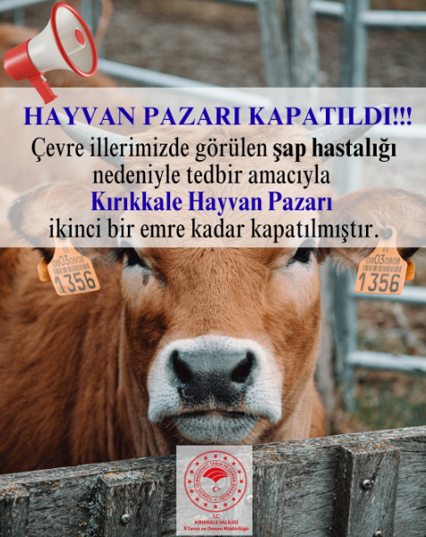 Kırıkkale’nin çevre illerinde, besilik hayvanlarda görülen şap hastalığı, Kırıkkale Tarım ve Orman İl Müdürlüğü’nü harekete geçirdi. Müdürlükten yapılan açıklamada, Kırıkkale’de bulunan hayvan pazarının tedbir amacıyla ikinci bir emre kadar kapatıldığı belirtildi.