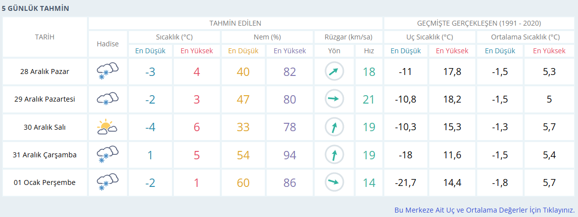 30 Aralık Salı günü parçalı bulutlu bir hava beklenirken, 31 Aralık Çarşamba günü kar yağışı yeniden etkili olacak. Çarşamba günü hava sıcaklığı gündüz 5 dereceye kadar çıkacak, gece ise 1 derece civarında olacak.