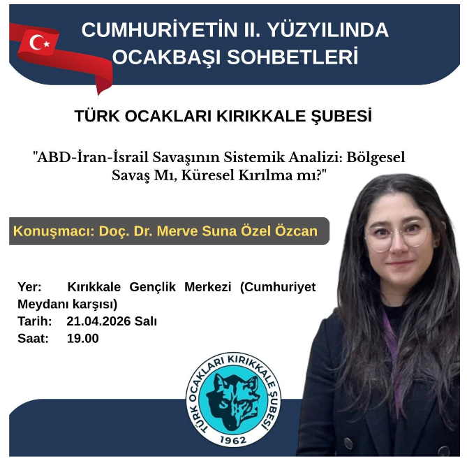 “ABD–İran–İsrail savaşının sistematik analizi: Bölgesel savaş mı, küresel kırılma mı?” başlıklı söyleşide, Doç. Dr. Merve Suna Özel Özcan konuşmacı olarak yer alacak. Programda Orta Doğu’daki güç dengeleri, küresel etkiler ve olası senaryolar akademik bir perspektifle değerlendirilecek. Etkinlik, bugün saat 19.00’da Kırıkkale Gençlik Merkezi’nde (Cumhuriyet Meydanı karşısı) gerçekleştirilecek. Türk Ocakları Kırıkkale Şubesi yetkilileri, konuya ilgi duyan tüm vatandaşları programa davet etti.