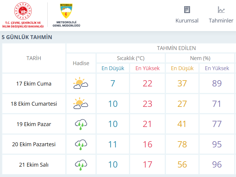 21 Ekim Salı: En düşük 10°C, en yüksek 17°C, yağışlı hava devam edecek.