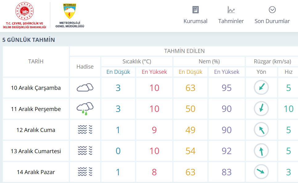 Yayımlanan 5 günlük hava durumu raporuna göre perşembe günü sıcaklıkların 3°C ile 10°C arasında değişeceği, gün içinde zaman zaman yağmur geçişlerinin görüleceği bildirildi. Nem oranının yüzde 50–90 arasında seyredeceği tahmin edilirken, rüzgârın güneydoğu yönünden 10 km/s hızla eseceği öngörülüyor. Yetkililer, perşembe günü dışarı çıkacak vatandaşların yağış ihtimaline karşı tedbirli olmalarını öneriyor.
