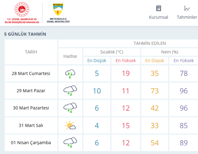 Meteoroloji verilerine göre 28 Mart Cumartesi günü kentte yağmurlu hava beklenirken sıcaklık en düşük 5, en yüksek 19 derece olacak. Nem oranının yüzde 35 ile 78 arasında değişeceği, rüzgarın ise saatte 17 kilometre hızla eseceği tahmin ediliyor. 29 Mart Pazar günü yağış devam edecek. Gün içinde sıcaklığın 10 ila 11 derece arasında seyretmesi beklenirken nem oranı yüzde 96’ya kadar çıkacak. 30 Mart Pazartesi günü de yağmurun etkisini sürdüreceği tahmin edilirken sıcaklık 6 ila 12 derece arasında olacak. 31 Mart Salı günü ise parçalı bulutlu ve güneşli bir hava bekleniyor. Sıcaklığın en düşük 4, en yüksek 15 dereceye ulaşacağı öngörülüyor. 1 Nisan Çarşamba günü yeniden yağışlı havanın etkili olması beklenirken sıcaklığın 6 ila 12 derece arasında değişeceği bildirildi.