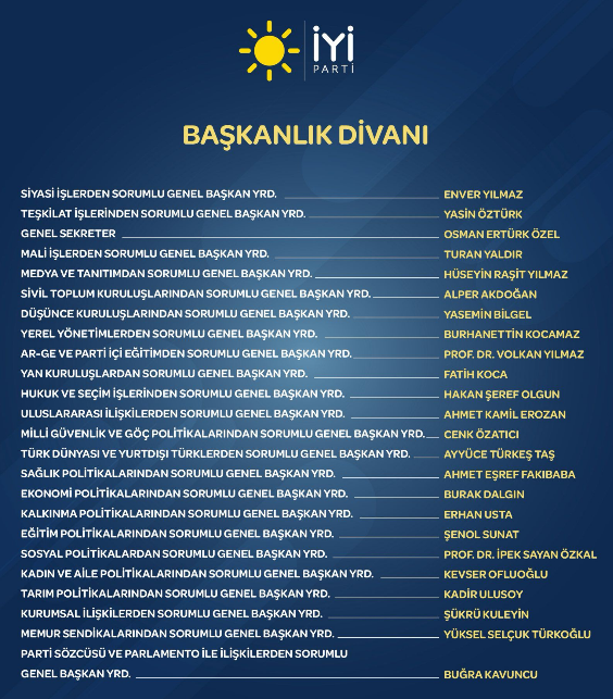 İYİ Parti Sivil Toplum Kuruluşlarından Sorumlu Genel Başkan Yardımcılığı göreviyle güven tazeleyen Akdoğan, İYİ Parti yönetimindeki etkin konumunu sürdürdü. Kurultay sürecinde delegelerin desteğini bir kez daha alan Akdoğan’ın, hem Genel İdare Kurulu’nda hem de divanda görev alması dikkat çekti. Teşkilat çalışmaları ve sivil toplum alanındaki faaliyetleriyle bilinen Akdoğan’ın, yeni dönemde de aktif bir rol üstlenmesi bekleniyor.