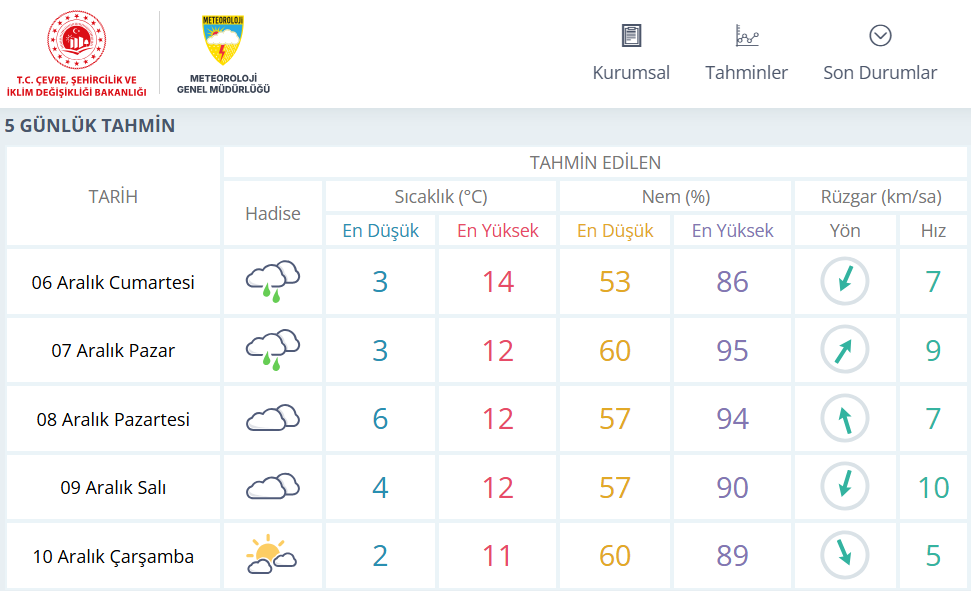 10 Aralık Çarşamba günü ise parçalı güneşli bir hava bekleniyor. Sıcaklıkların 2 ile 11 derece arasında olacağı tahmin ediliyor.