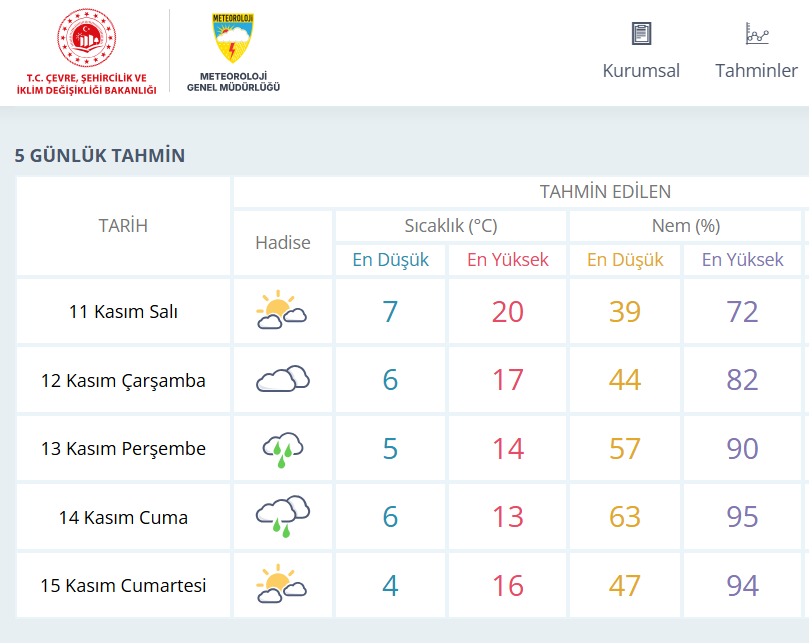 Tahminlere göre, 13 Kasım Perşembe günü kentte hafif yağmur bekleniyor. Hava sıcaklığı en düşük 5, en yüksek 14 derece olacak. 14 Kasım Cuma günü ise yağışların yer yer etkisini artırması öngörülüyor. Cuma günü sıcaklık en düşük 6, en yüksek 13 derece olarak tahmin edilirken, nem oranının yüzde 95’e kadar çıkması bekleniyor. Hafta sonuna doğru yağışların yerini parçalı bulutlu bir havaya bırakması bekleniyor. 15 Kasım Cumartesi günü havanın az bulutlu, sıcaklıkların ise 4 ila 16 derece arasında seyredeceği bildirildi. Meteoroloji, yağışlı günlerde sürücülerin ve vatandaşların dikkatli olmaları konusunda uyarıda bulundu.