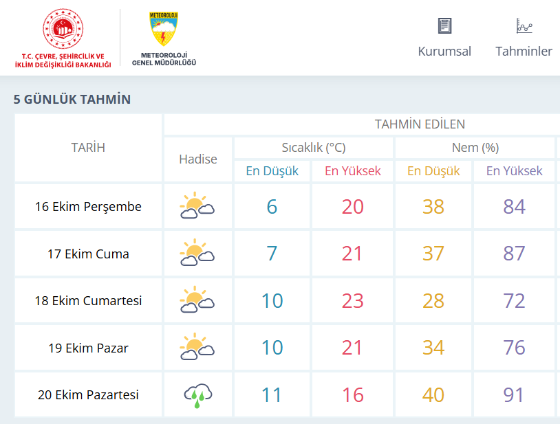 16 Ekim Perşembe günü sabah saatlerinde 6 dereceye kadar düşecek sıcaklık, gün içinde 20 dereceye kadar yükselecek. Cuma günü hava 21 dereceyle benzer seyredecek. Hafta sonu ise hava sıcaklıkları artış göstererek Cumartesi günü 23 derece, Pazar günü 21 derece olacak. Her iki günde de kent genelinde güneş zaman zaman yüzünü gösterecek.