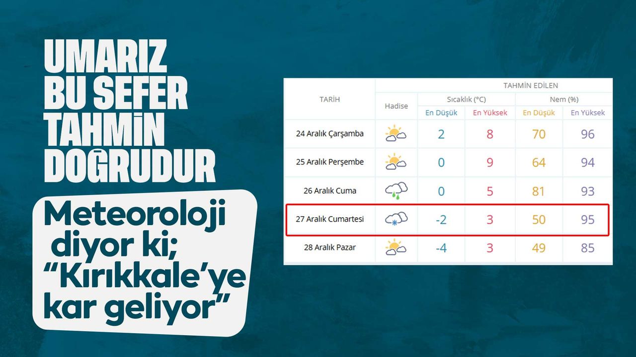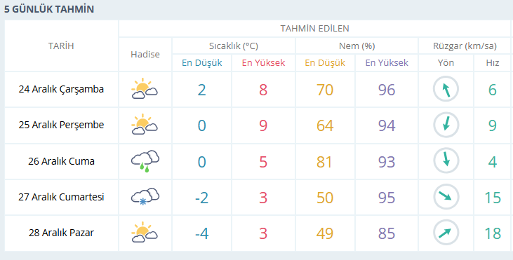 Tahminlere göre 26 Aralık Cuma günü kentte yağmur etkili olacak. Günün en düşük sıcaklığının 0 derece, en yüksek sıcaklığının ise 5 derece olması bekleniyor. Nem oranının yüzde 81 ile 93 arasında seyredeceği, rüzgarın saatte 4 kilometre hızla eseceği tahmin ediliyor. 27 Aralık Cumartesi günü ise hava sıcaklıklarının düşmesiyle birlikte kar yağışı bekleniyor. Cumartesi günü en düşük sıcaklık -2 derece, en yüksek sıcaklık 3 derece olacak. Rüzgar hızının saatte 15 kilometreye kadar çıkabileceği bildirildi. Meteoroloji yetkilileri, özellikle Cumartesi günü beklenen kar yağışıyla birlikte buzlanma ve don riskine karşı sürücülerin ve vatandaşların dikkatli olması gerektiği uyarısında bulundu. Öte yandan Pazar günü hava sıcaklıklarının daha da düşmesiyle birlikte gece saatlerinde -4 dereceye kadar inmesi bekleniyor.