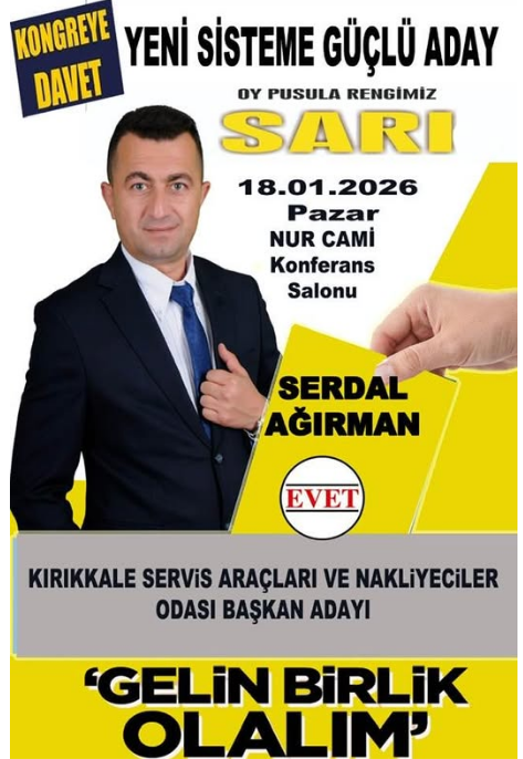 Serdar Ağırman, esnafın sorunlarını yakından bildiğini ve çözüm odaklı bir yönetim anlayışıyla hareket edeceklerini ifade ederek, “Bu oda hepimizin. Gelin birlik olalım, sorunları birlikte çözelim” dedi. Kırıkkale Servis Araçları ve Nakliyeciler Odası’nda yapılacak kongrenin, esnafın geleceği açısından önemli bir dönüm noktası olacağını belirten Ağırman, tüm üyeleri sandığa giderek demokratik iradelerini ortaya koymaya çağırdı.