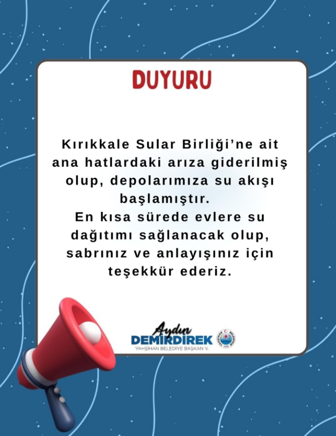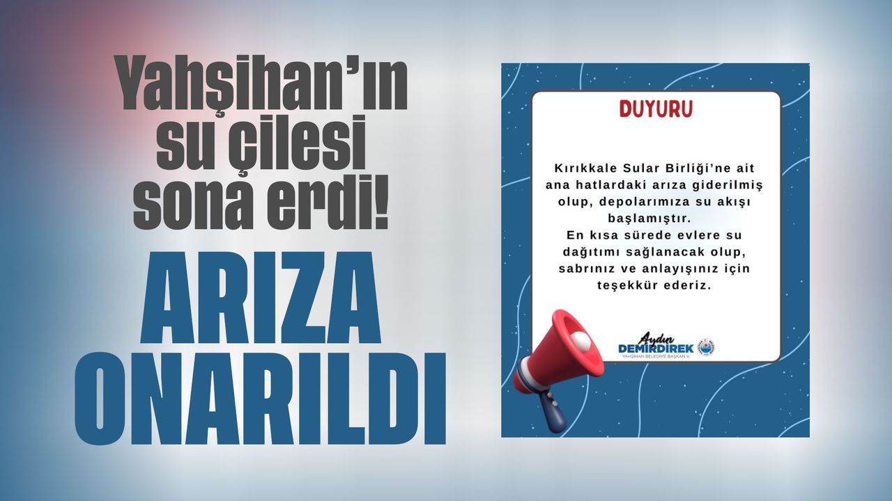 Kırıkkale Sular Birliği’ne ait ana hatlarda yaşanan sorun nedeniyle hem Kırıkkale Merkez’in bazı bölgelerine hem de Yahşihan ilçesine 24 saatten uzun süre su verilememişti. Yahşihan Belediyesi, yaptığı açıklamada arızanın tamamen onarıldığını duyurdu. Belediye, “Kırıkkale Sular Birliği’ne ait ana hatlardaki arıza giderilmiş olup depolarımıza su akışı başlamıştır. En kısa sürede evlere su dağıtımı sağlanacaktır. Sabrınız ve anlayışınız için teşekkür ederiz.” ifadelerini kullandı. Su akışının başlamasıyla birlikte ilçede yaşanan susuzluk çilesi sona ererken, belediye ekiplerinin bölgede kontrolleri sürdürdüğü belirtildi.