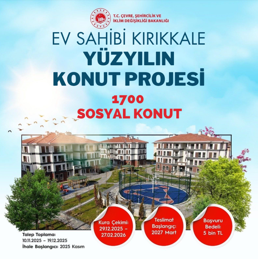 Proje kapsamında talep toplama süreci 10 Kasım 2025 – 19 Aralık 2025 tarihleri arasında gerçekleştirilecek. İhale sürecinin 2025 Kasım ayında başlaması planlanırken, başvuru bedeli ise 5 bin TL olarak belirlendi. Konutlar için kura çekimi 29 Aralık 2025 – 27 Şubat 2026 tarihleri arasında yapılacak. Hak sahiplerinin belirlenmesinin ardından inşaat sürecine geçilecek ve teslimatlar 2027 yılı Mart ayında başlayacak. Proje kapsamında inşa edilecek konutların, modern yaşam alanlarıyla birlikte sosyal donatı alanları, yeşil çevre düzenlemesi ve çocuk oyun alanlarıyla desteklenmesi planlanıyor. Kırıkkale’de konut ihtiyacını büyük ölçüde karşılaması beklenen proje, aynı zamanda şehir ekonomisine de canlılık kazandıracak.