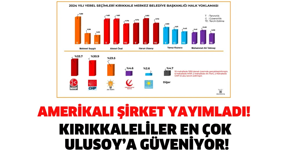 Amerika merkezli olan ve ülkemizde de seçimlerde saha anketlerinde faaliyet göstermeye başlayan PEW R.C. araştırma merkezi Türkiye için araştırma raporu yayınladı. Kırıkkale’de bin 250 kişi üzerinde yapılan sonuçlara göre MHP 33,7, CHP 30,9, AK Parti 23,5, YRP 4,6, İYİ Parti 2,6 ve karasız seçmen 4,7 olarak gösterildi.