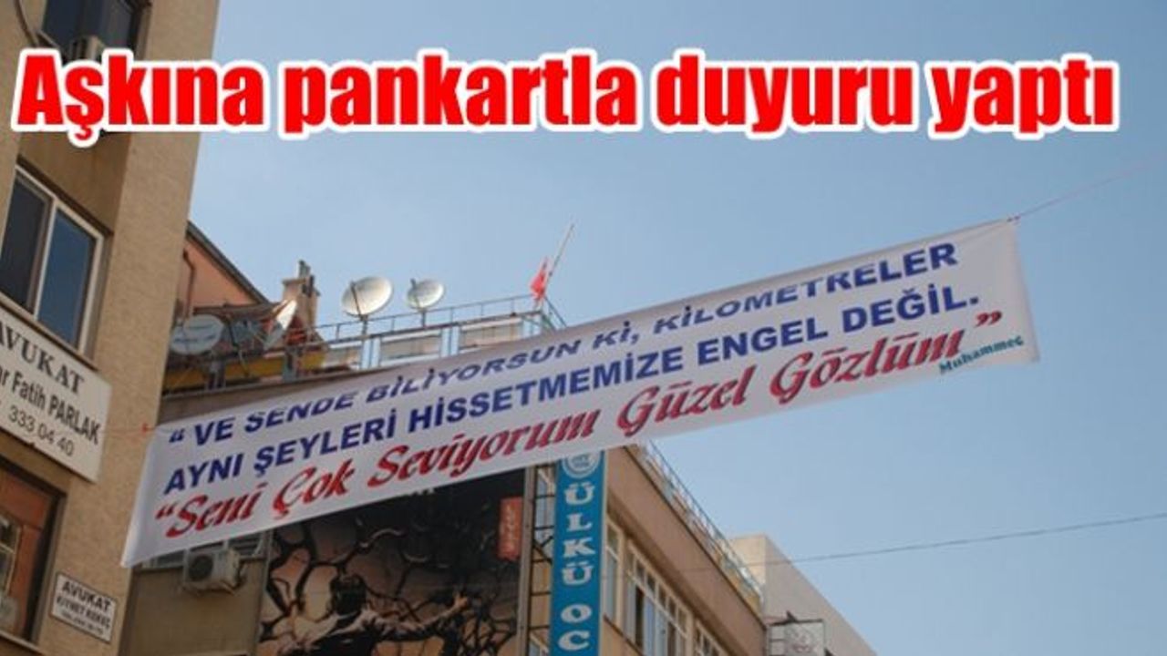 Kırıkkaleli bir esnaf şehir dışında bulunan aşkına pankartla duyuru yaptı. Zafer Caddesi üzerine pankart asan esnaf Muhammed Emin Çevik pankartta, 'Sende biliyorsun ki, kilometreler aynı şeyleri hissetmemize engel değil. Seni çok seviyorum, güzel gözlüm.' diyerek caddeden geçenlere ve sözlüsü olduğunu söyledi kıza aşkını anlatmaya çalıştı. Gizem adlı sözlüsünün şehir dışında gittiğini açıklayan Muhammed Emin Çevik, 'Sevdiğimi insanla ilerde evlenmeyi düşünüyorum.' dedi.