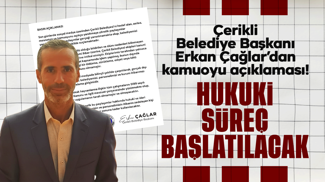 Belediye Başkanı Çağlar, olayın sosyal medyada bilinçli şekilde çarpıtılarak gerçek dışı iddialarla servis edilmesini, belediye, personel ve kurum itibarını hedef alan açık bir karalama girişimi olarak nitelendirdi. Açıklamada ayrıca, Çerikli Belediyesi’nin sokak hayvanlarına yönelik tüm çalışmalarını 5199 sayılı Hayvanları Koruma Kanunu ve ilgili mevzuat çerçevesinde yürüttüğü vurgulanarak, hukuka aykırı hiçbir uygulamanın tarafı olunmadığı ve olunmayacağı ifade edildi.