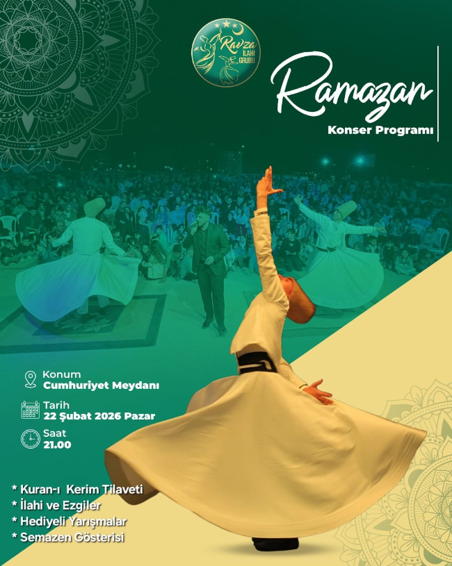 Bu akşam programın en dikkat çeken bölümünde Ravza İlahi Grubu sahneye çıkacak. Gönüllere hitap eden ilahiler ve semazen gösterileriyle meydanı dolduran vatandaşlara manevi bir gece yaşatılması hedefleniyor. İlahi ezgiler eşliğinde gerçekleştirilecek sema gösterileri, izleyenlere hem görsel hem de ruhani bir atmosfer sunacak. Program bugün akşam saat 21.00'de Cumhuriyet Meydanı'nda düzenlenecek.