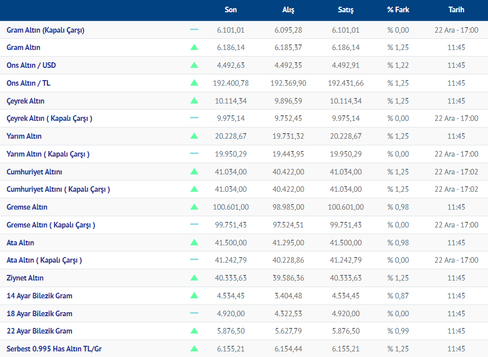 Günün ilk saatleri itibarıyla 24 ayar gram altının alış fiyatı 6 bin 186 liraya ulaştı. Gram altın, bir önceki kapanışa göre yaklaşık yüzde 1,18 oranında değer kazandı. Piyasada en saf altın türleri arasında yer alan has altın (0,9999) da yükselişini sürdürdü. Has altının satış fiyatı 6 bin 208 lirayı aşarken, külçe altın ve diğer ayar gruplarında da benzer artışlar dikkat çekti.