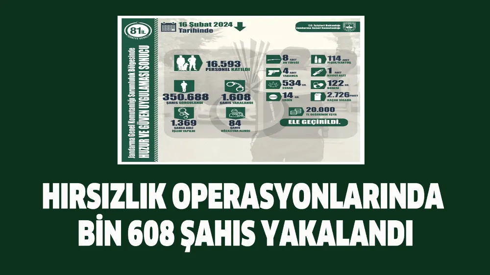 Jandarma Genel Komutanlığı sosyal medya hesabından yaptığı paylaşımla, kendi sorumluluk bölgelerinde gerçekleştirdiği huzur ve güven operasyonlarında yakalanan şahısları ve ele geçirilen maddeleri açıkladı. Paylaşılan bilgilere göre, Kırıkkale de dahil olmak üzere 81 ilde eş zamanlı olarak gerçekleştirilen operasyonlarda, 16 bin 593 personelin katıldığı operasyonlarda, 350 bin 688 şahıs sorgulandığı, bin 608 şahısın ise yakalandığı ifade edildi. Yakalanan şahıslardan bin 369’una adli işlem yapılırken 84 şahısın ise göz altına alındığı bilgisi verildi. Operasyonlar sonucunda ele geçirilenler hakkında ise; 8 adet av tüfeği, 4 adet tabanca, 534 gram esrar, 14 gram eroin, 114 adet fişek, 1 adet kesici alet, 122 gram bonzai, 2 bin 726 paket kaçak sigara ve 20 bin tl değerinde eşyadan oluştuğu bilgisi verildi.