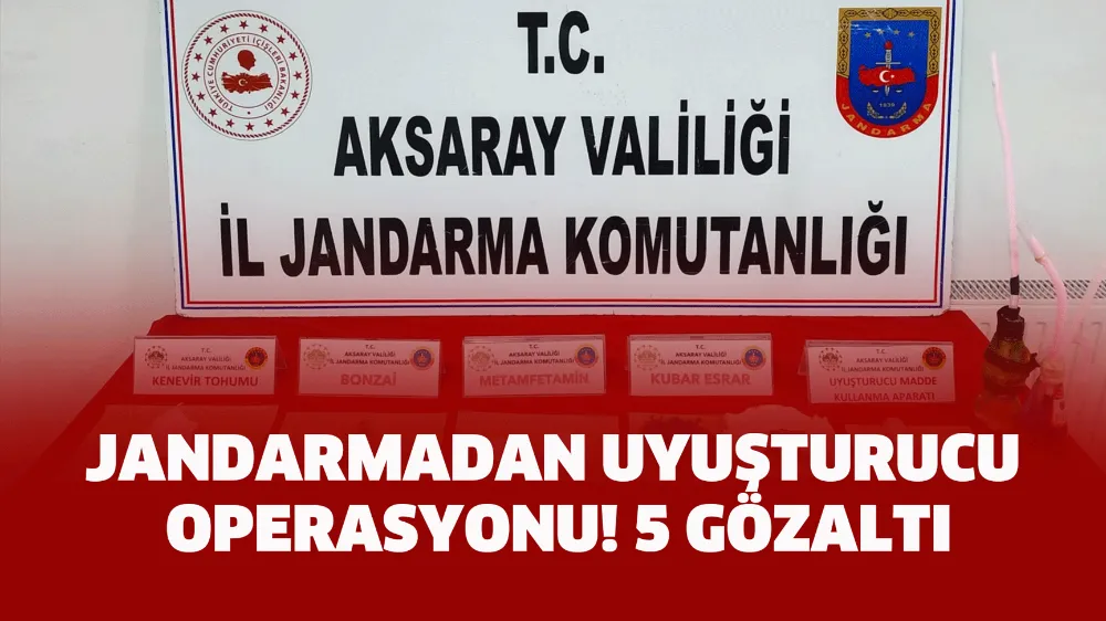 Edinilen bilgiye göre, uyuşturucuyla mücadele çerçevesinde çeşitli çalışalar yapan Aksaray İl Jandarma Komutanlığı İstihbarat Şubesi ekipleri yapılan çalışmalarda 5 şahsın uyuşturucu madde kullandığı, bulundurduğu ve ticaretini yaptığı bilgisine ulaştı. Aksaray Cumhuriyet Başsavcılığı koordinesinde harekete geçen jandarma ekipleri, 6 gün süren teknik ve fiziksel takibin ardından tespit edilen adrese operasyon düzenledi. Operasyonda 5 şüpheli yakalanarak gözaltına alındı. Evde yapılan aramalarda 10 gram metamfetamin, 20 gram kubar esrar, 5 gram sentetik cannobinoid bonzai ve 4 adet uyuşturucu kullanma aparatı ele geçirildi. Şüpheliler sorgulanmak üzere İl Jandarma Komutanlığına götürülürken buradaki işlemlerin ardından adli makamlara sevk edildi.