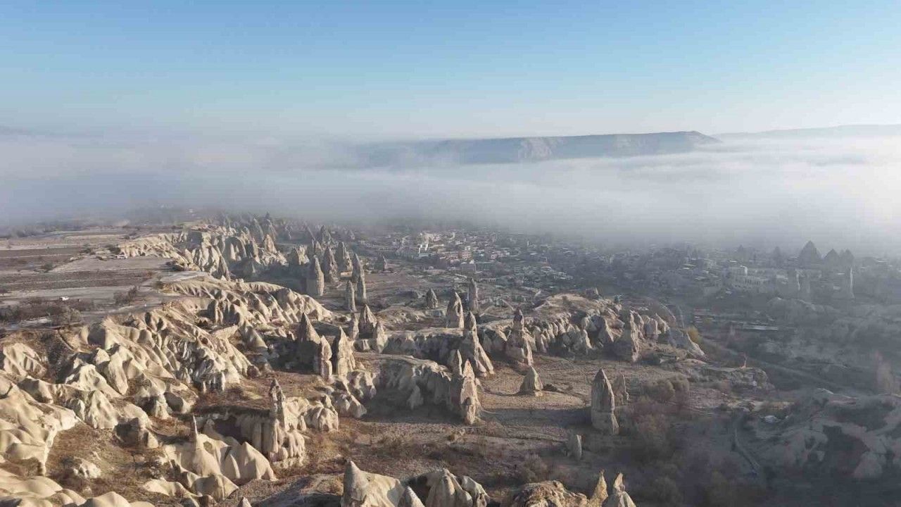 UNESCO Dünya Doğal ve Kültürel Miras Listesi’nde yer alan, Türkiye’nin dünyaca ünlü turizm merkezi Kapadokya, sabahın erken saatlerinde etkili olan yoğun sisle birlikte adeta masalsı bir atmosfere büründü. Peribacaları, vadiler ve sıcak hava balonlarının kalkış alanları sis bulutu altında gizemli görüntüler oluşturdu. O anlar havadan görüntülendi.