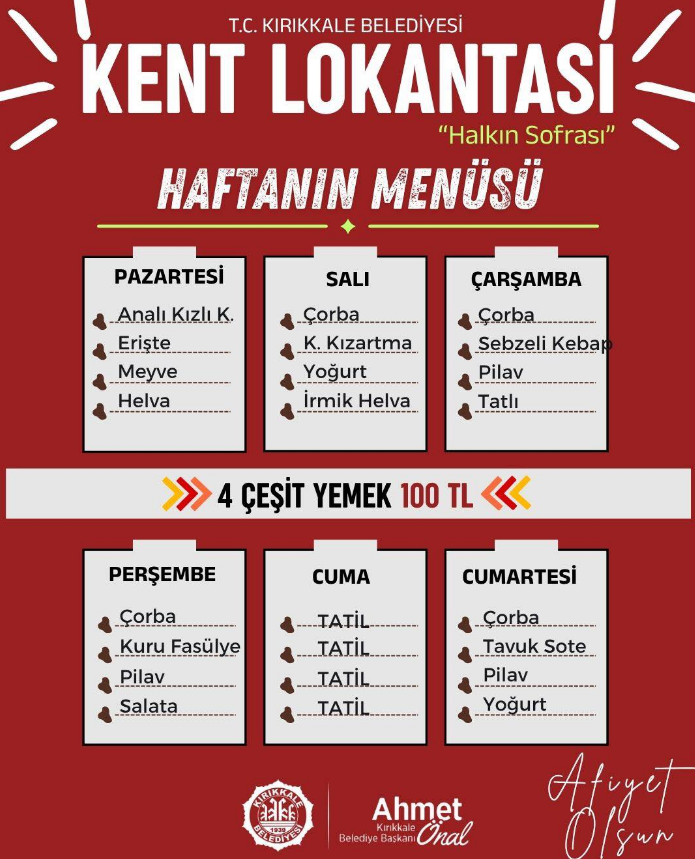 Açıklanan programa göre haftalık menü şu şekilde: