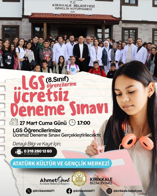 Belediye tarafından yapılan açıklamada, gençlerin eğitim sürecinde yanında olmaya devam edildiği vurgulanarak, Kırıkkale genelindeki öğrencilere yönelik ücretsiz deneme sınavının Atatürk Kültür ve Gençlik Merkezi’nde gerçekleştirileceği bildirildi. 27 Mart Cuma günü saat 17.00’de yapılacak sınavın, öğrencilerin sınav öncesi eksiklerini görmeleri ve kendilerini denemeleri açısından önemli bir fırsat sunacağı belirtildi. Kayıt ve detaylı bilgi almak isteyen öğrenciler ile velilerin merkeze başvurabileceği veya 0 318 280 12 60 numaralı telefondan bilgi alabileceği ifade edildi.