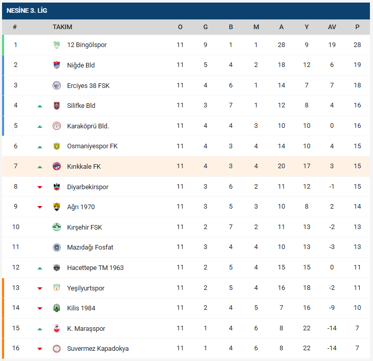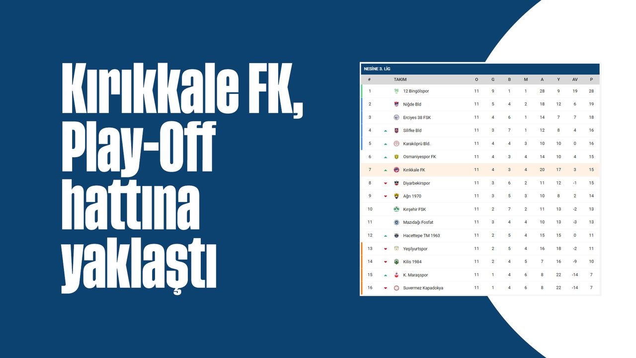 Kırıkkale FK ligde çıktığı 11 maçta 4 galibiyet ve 3 beraberlik elde ederken, sahadan 4 kez mağlup ayrıldı. 20 gol atma başarısı gösteren Kırıkkale FK, kalesinde ise 17 kez gol gördü. Çıktığı 11 maçta 15 puan toplayan Kırıkkale Futbol Kulübü, Paly-Off hattının sadece 2 sıra gerisinde bulunuyor.