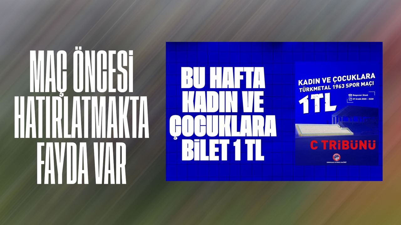 Karşılaşma, bugün saat 13.00’te Kırıkkale Başpınar Stadı’nda oynanacak. Kulüp, karşılaşma öncesinde kadın ve çocuklara yönelik özel bir kampanya duyurdu. Yapılan açıklamada, C Tribünü’nde kadın ve çocuk taraftarların bileti yalnızca 1 TL olarak belirlendi. Uygulamanın tribünlerdeki desteği artırmayı ve ailelerin maça katılımını teşvik etmeyi amaçladığı belirtildi. Kırıkkale FK, kritik karşılaşmada taraftar desteğini arkasına alarak sahadan 3 puanla ayrılmayı hedefliyor.