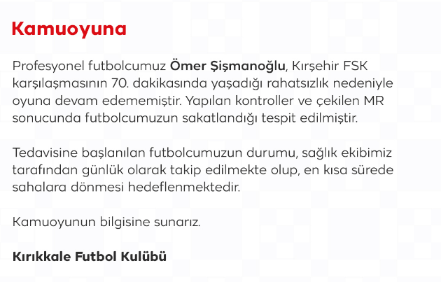 Kulüpten yapılan açıklamada, karşılaşmanın 70. dakikasında rahatsızlanarak oyuna devam edemeyen Ömer Şişmanoğlu’nun yapılan kontroller ve çekilen MR sonucu sakatlandığı belirtildi. Tedavisine başlanan tecrübeli futbolcunun durumunun sağlık ekibi tarafından günlük olarak takip edildiği ve kısa sürede sahalara dönmesinin hedeflendiği ifade edildi. Kırıkkale FK, açıklamasında kamuoyuna geçmiş olsun dileklerini iletti.