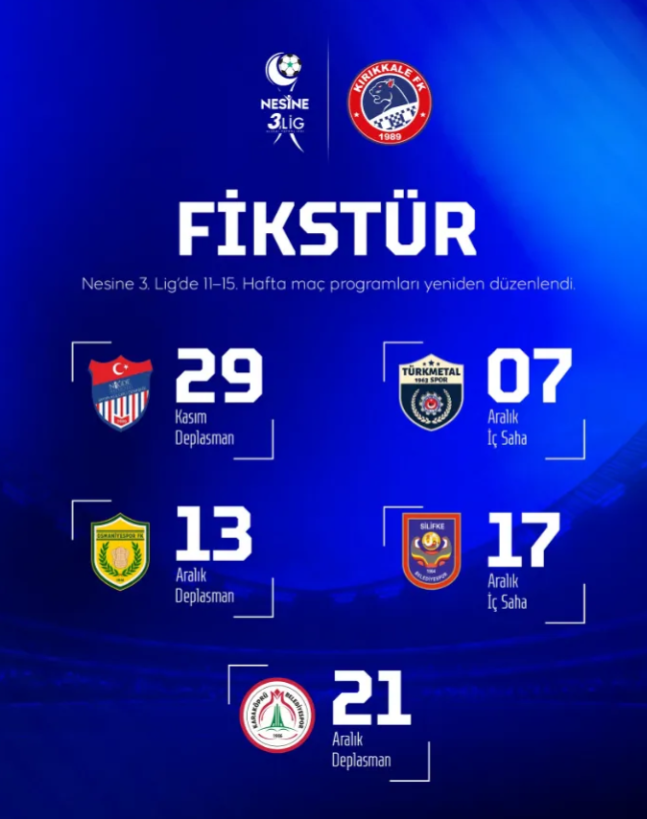 Geçtiğimiz haftalarda başlayan bahis soruşturması nedeniyle, 1024 futbolcunun PFDK’ye sevk edilmesinin ardından Türkiye Futbol Federasyonu, TFF 2. Lig ve Kırıkkale FK’nin de mücadele ettiği TFF 3. lig maçlarının ertelendiğini duyurmuştu. Takımların maç takvimi belli oldu. Kırıkkale temsilcisi Kırıkkale Futbol Kulübü, 29 Kasım Cumartesi günü Niğde Belediyespor’a konuk olacak. Ardından 7 Aralık Pazar günü Hacettepe TM 1963’ü konuk edecek. Kırıkkale FK, bahis soruşturması nedeniyle lige ara verilmesine rağmen antrenmanlara ara vermeden devam ediyor.