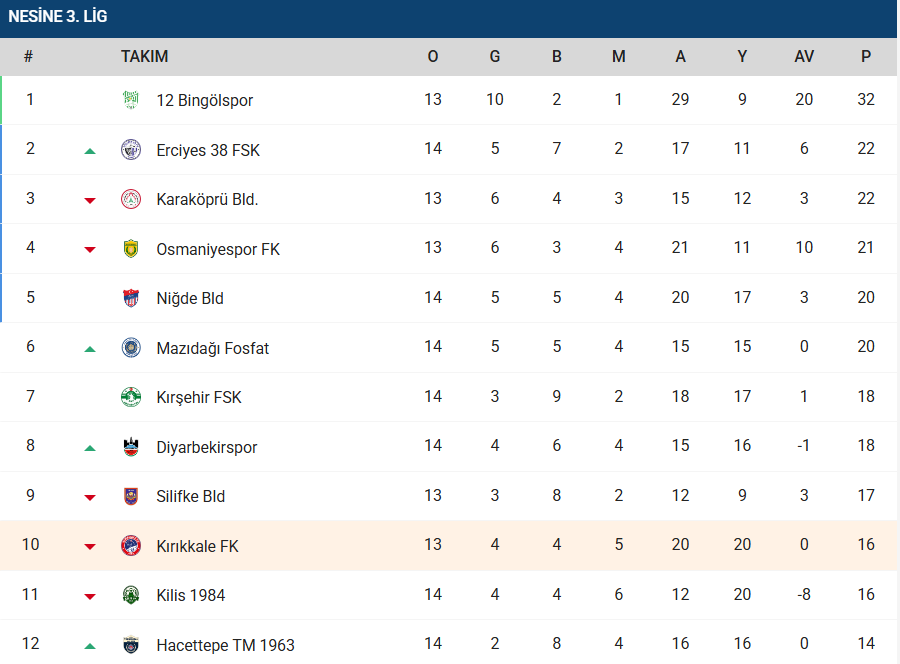 TFF 3. Lig’de heyecan devam ediyor. Ligde 13 hafta geride kalırken, Kırıkkale temsilcisi Kırıkkale Futbol Kulübü, 16 puanla 13. sırada bulunuyor. Kırıkkale FK, ligde oynadığı 13 maçta 4 galibiyet ve 4 beraberlik elde ederken, 5 maçta ise sahadan mağlubiyetle ayrıldı. 13 maçta 20 kez rakip takımın filelerini havalandıran Kırmızı-Lacivertliler, kalelerinde ise 20 gol gördü.